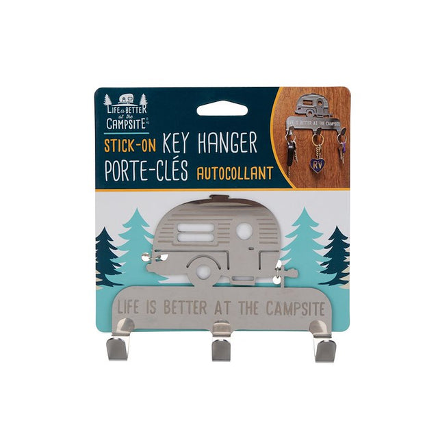 Camco Life is Better at The Campsite Stick-On 3-Hook Leash/Key Hanger | Features Retro Camper/RV Design & No Tool Installation | Crafted of Heavy-Duty Stainless Steel (53368)